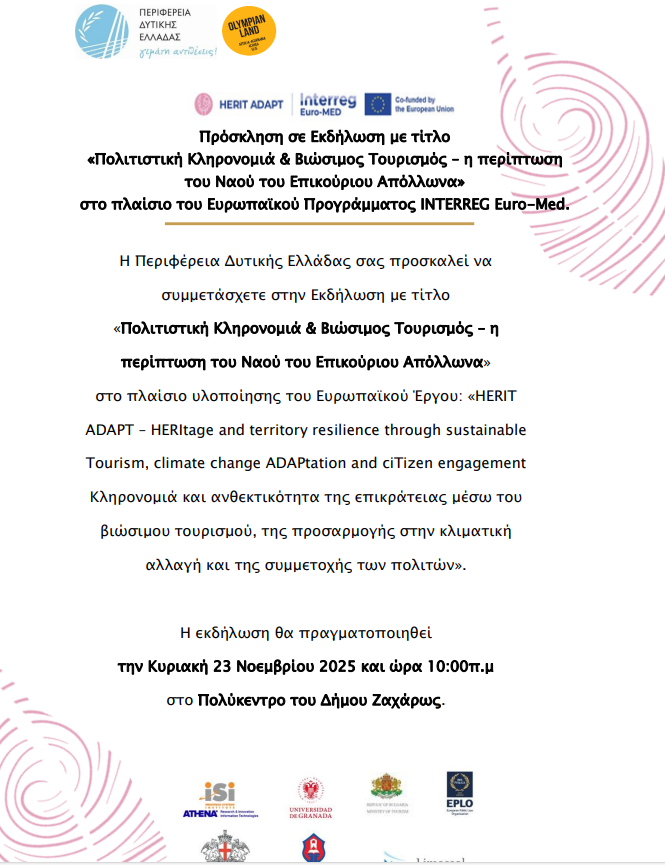 Η Περιφέρεια Δυτικής Ελλάδας διοργανώνει εκδήλωση με τίτλο «Πολιτιστική Κληρονομιά & Βιώσιμος Τουρισμός – η