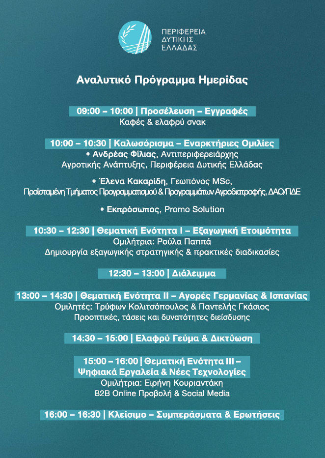 Η ημερίδα απευθύνεται σε επιχειρήσεις του αγροδιατροφικού τομέα της Περιφέρειας Δυτικής Ελλάδας που ενδιαφέρονται να αναπτύξουν την εξαγωγική τους δραστηριότητα και να εξερευνήσουν νέες διεθνείς αγορές.