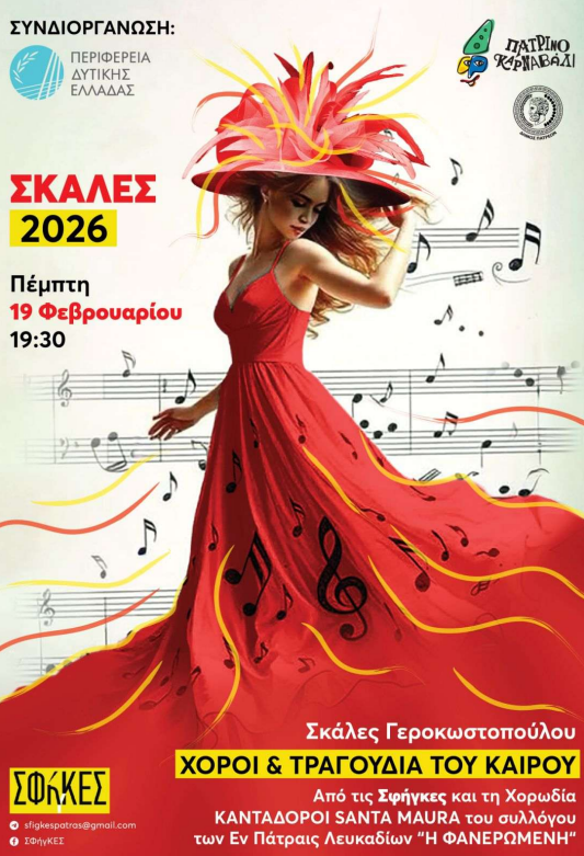 Φέτος, οι ΣΦήγΚΕΣ «κατακτούν» τις Σκάλες την Πέμπτη 19 Φεβρουαρίου 2026, στις 19:30, σε μια ξεχωριστή μουσικοχορευτική σύμπραξη με τη χορωδία Κανταδόροι «Αγία Μαύρα» και την Ορχήστρα των εν Πάτραις Λευκαδίων, υπό τη διεύθυνση της μαέστρου Δήμητρα Αψομώτου. Με κέφι, φαντασία και αστείρευτη δημιουργικότητα, προσθέτουν στο καρναβάλι μια ακόμη νότα χαράς και αισιοδοξίας.