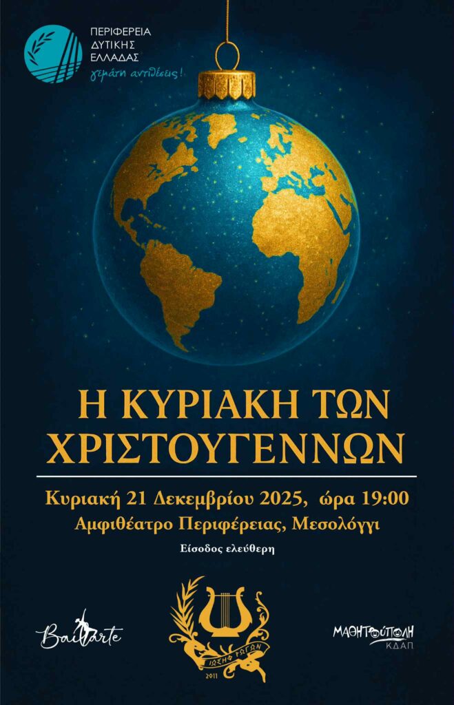 Η Περιφέρεια Δυτικής Ελλάδας διοργανώνει την Κυριακή 21 Δεκεμβρίου 2025 και ώρα 19:00 Χριστουγεννιάτικη μουσικοχορευτική παράσταση, στο διοικητήριο της ΠΕ Αιτωλοακαρνανίας με τίτλο: «Κυριακή των Χριστουγέννων». Μουσικοί, χορευτές, σολίστ, τύμπανα, φλογέρες, παιδικές φωνές θα μας ταξιδέψουν σε κάθε γωνιά του πλανήτη.
