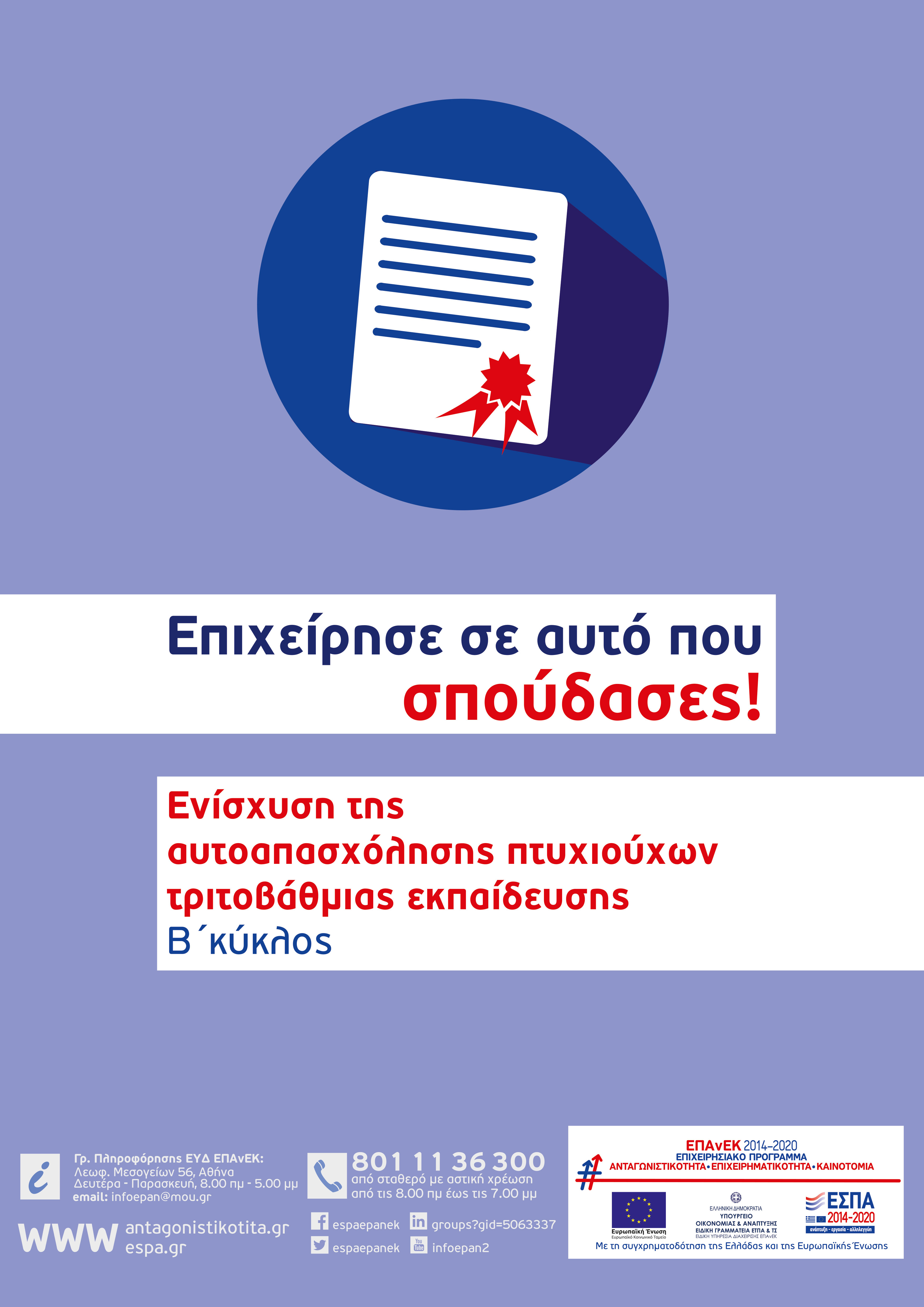Ενίσχυση της αυτοαπασχόλησης πτυχιούχων τριτοβάθμιας εκπαίδευσης: Αφίσα της δράσης σε μορφή JPG