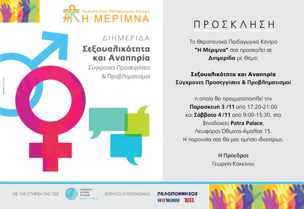 Η διημερίδα που έχει τίτλο: «Σεξουαλικότητα και Αναπηρία. Σύγχρονες προσεγγίσεις και Προβληματισμοί»» θα πραγματοποιηθεί στις 3 και 4 Νοεμβρίου στο ξενοδοχείο PATRAS PALACE.