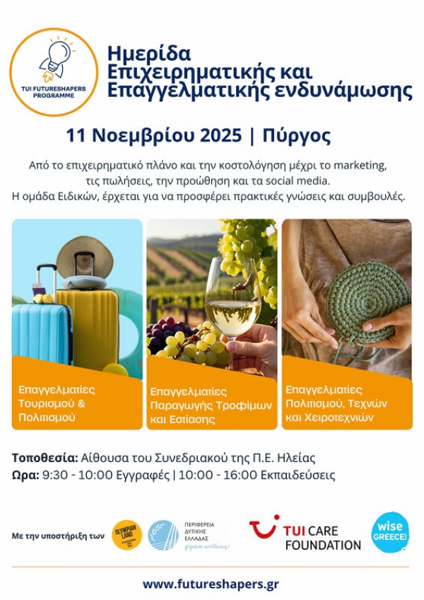 Η Περιφέρεια Δυτικής Ελλάδας σε συνεργασία με την Wise Greece και την υποστήριξη του TUI Care Foundation διοργανώνει Ημερίδα Επιχειρηματικής και Επαγγελματικής Ενδυνάμωσης για επαγγελματίες ή επιχειρηματίες που επιθυμούν να ενισχύσουν τις γνώσεις και τις δεξιότητές τους.
