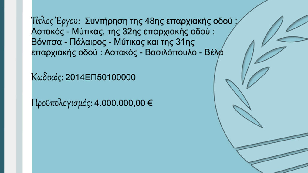Συντήρηση της 48ης Επαρχιακής Οδού: Αστακός – Μύτικας, της 32ης Επαρχιακής Οδού: Βόνιτσα – Πάλαιρος – Μύτικας και της 31ης Επαρχιακής Οδού: Αστακός, Βασιλόπουλο – Βέλα
