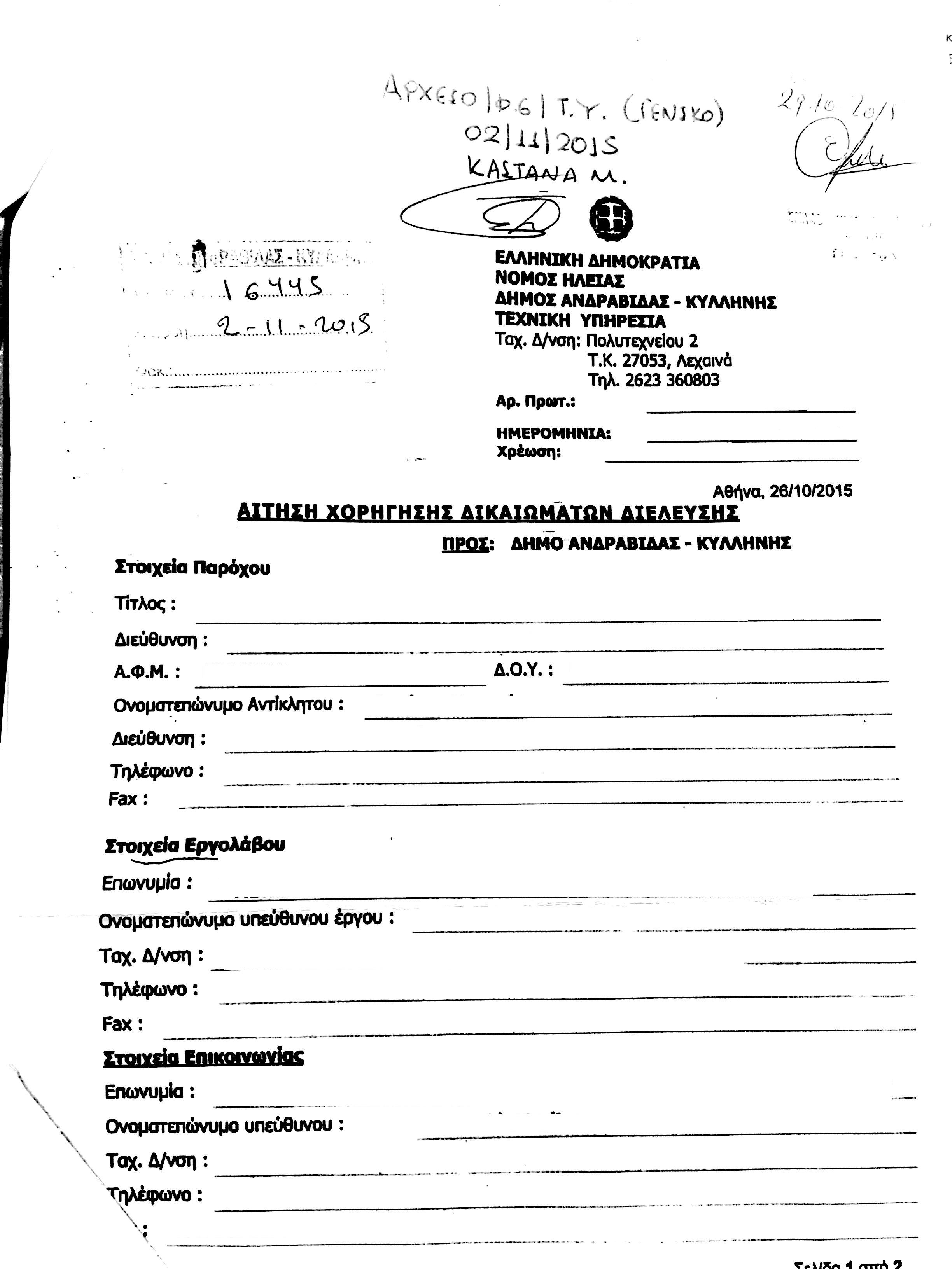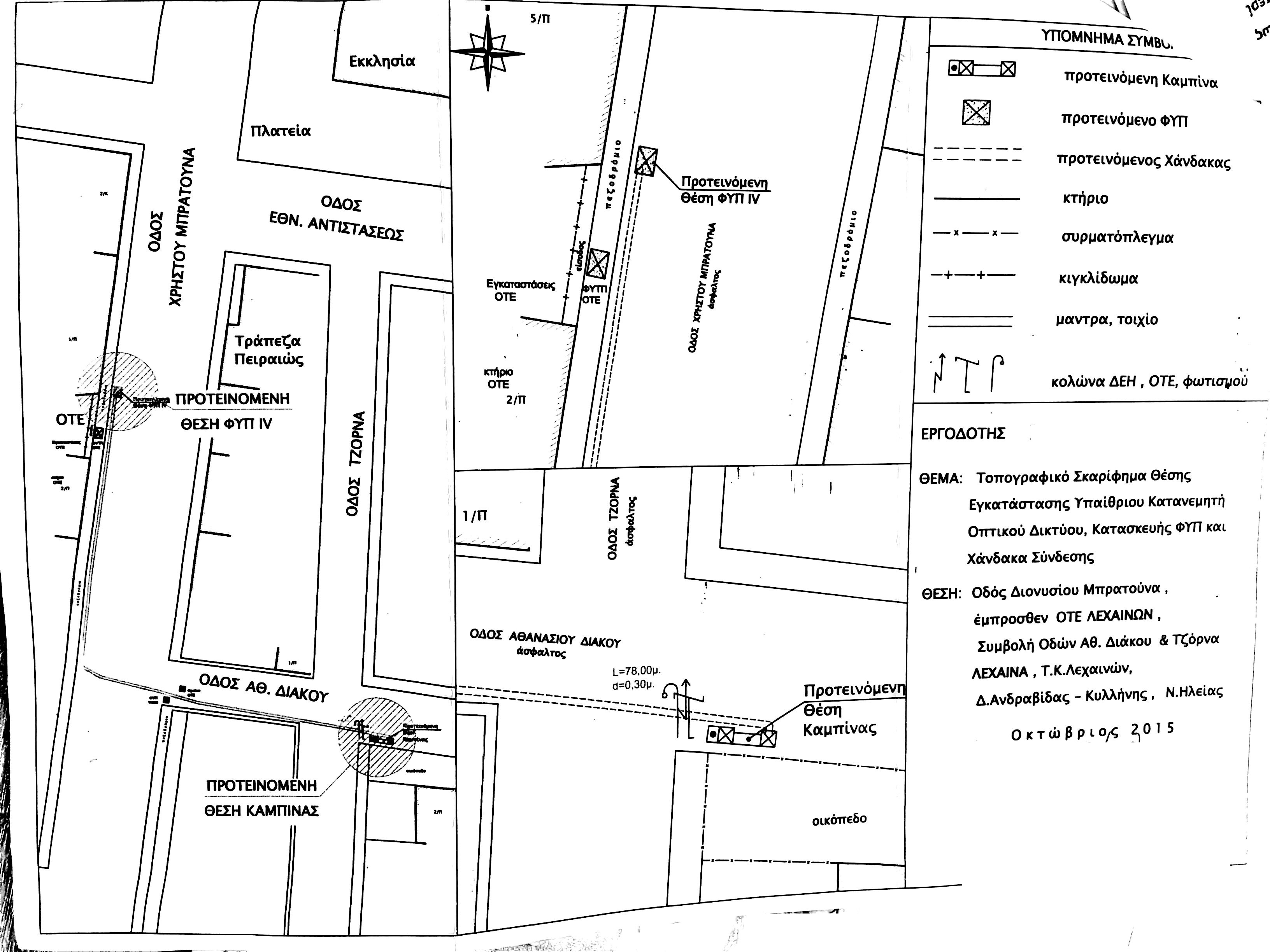 Σε συνέχεια αιτήσεως παροχου για την Χορήγηση Δικαιωμάτων Διέλευσης Οπτικών Ινών στο Δήμο Ανδραβίδας-Κυλλήνης, η οποια μας διαβιβάστηκε με το με αριθ 573/18-1-2016 έγγραφο Δήμου Ανδραβίδας-Κυλλήνης, γινεται η αναρτηση της μαζί με το συννημενο τοπογραφικό σχέδιο στον ιστοτοπο της ΠΔΕ Ηλείας όπως προβλέπεται σύμφωνα με το άρθρο 8 της υπ αριθ 725/23/4-1-2012 ΚΥΑ (ΦΕΚ 5/Β/5-1-2012).